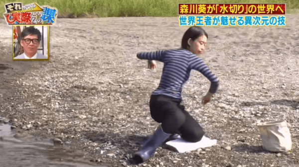 오늘의 미션 물수제비 15회에 도전하는 모리카와 아오이.
